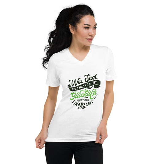T-Shirt mit V-Ausschnitt aus 100% Baumwolle für Damen | "Wer sagt, Geld macht nicht glücklich, kennt mein Finanzamt nicht"